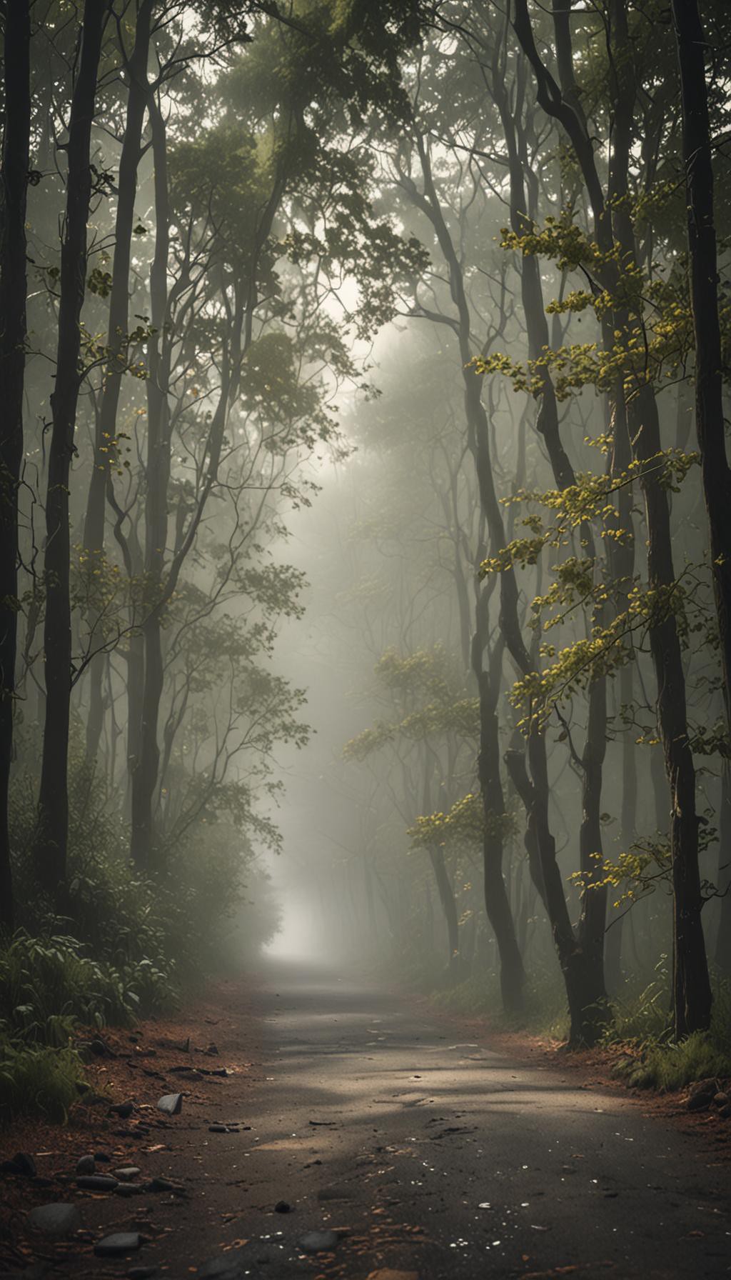 Evening Fog Forest Road – Cozy Cinematic Wallpaper