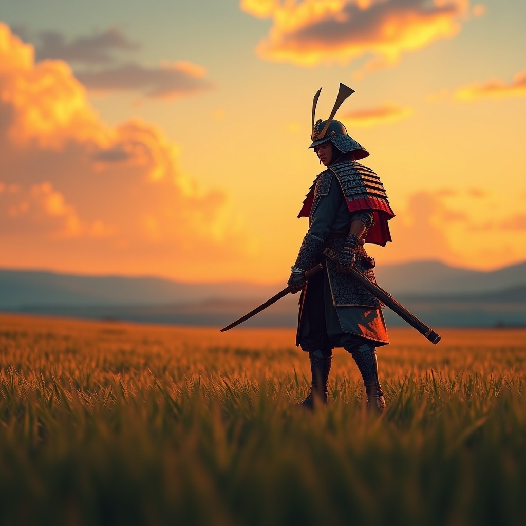 Lone Samurai 4K - High quality 4K wallpaper, lone samurai on a peaceful plain, vivid, abstract, cartoon like, wallpaper, ultra high quality, 8k, professional photography, dramatic lighting, natural colors, golden hour