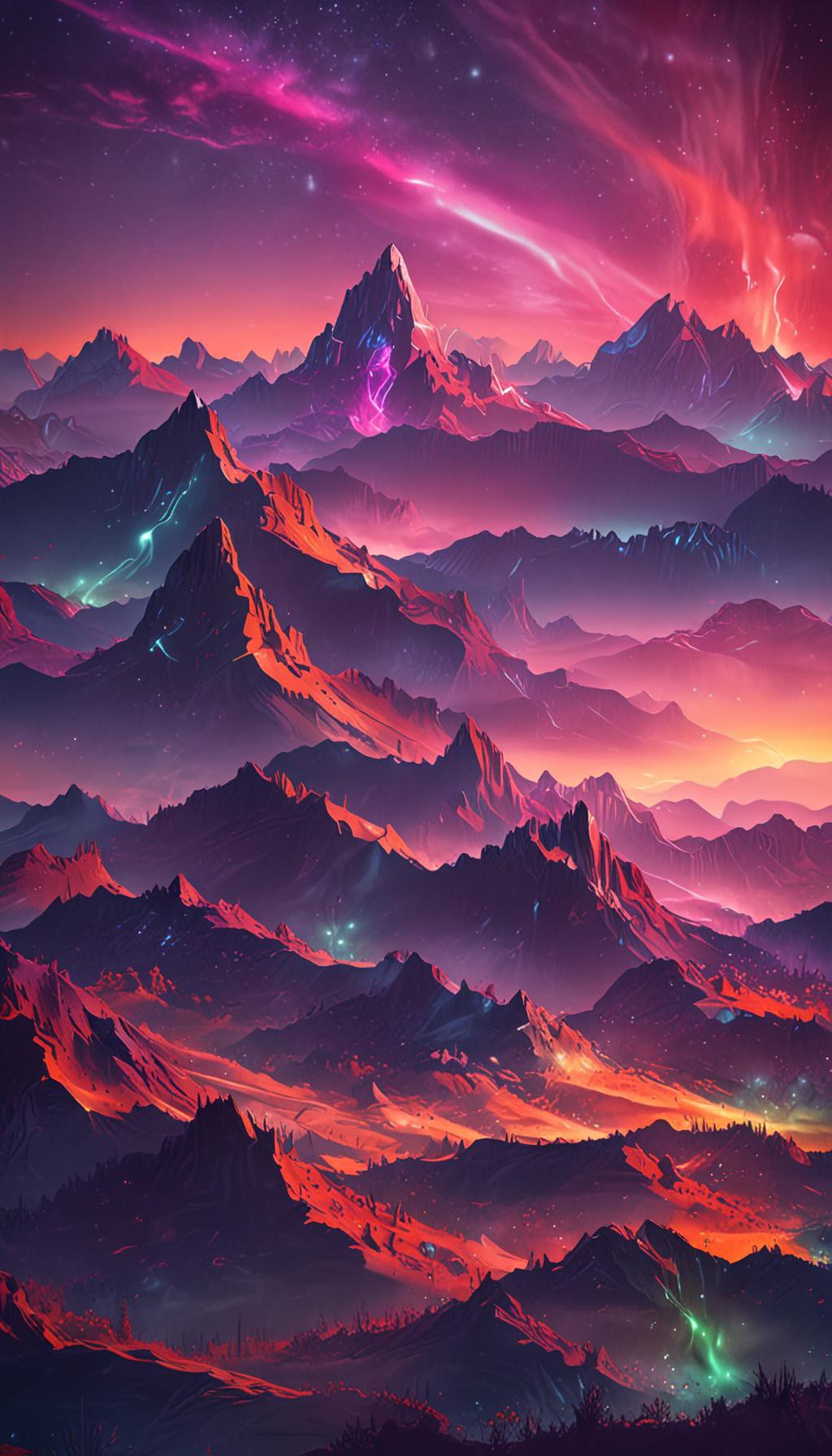 Neon Aurora Over Fractal Mountains