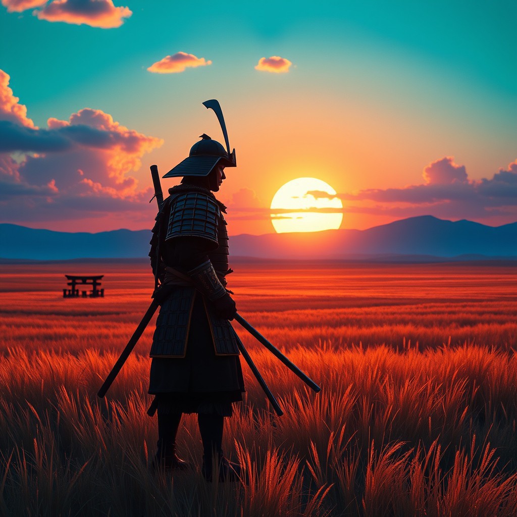 Oled Samurai 4K - High quality 4K wallpaper, lone samurai on a peaceful plain, vivid, abstract, cartoon like, wallpaper, ultra high quality, 8k, professional photography, dramatic lighting, natural colors, golden hour, far camera view, angled camera, different time of day, oled, enhanced details