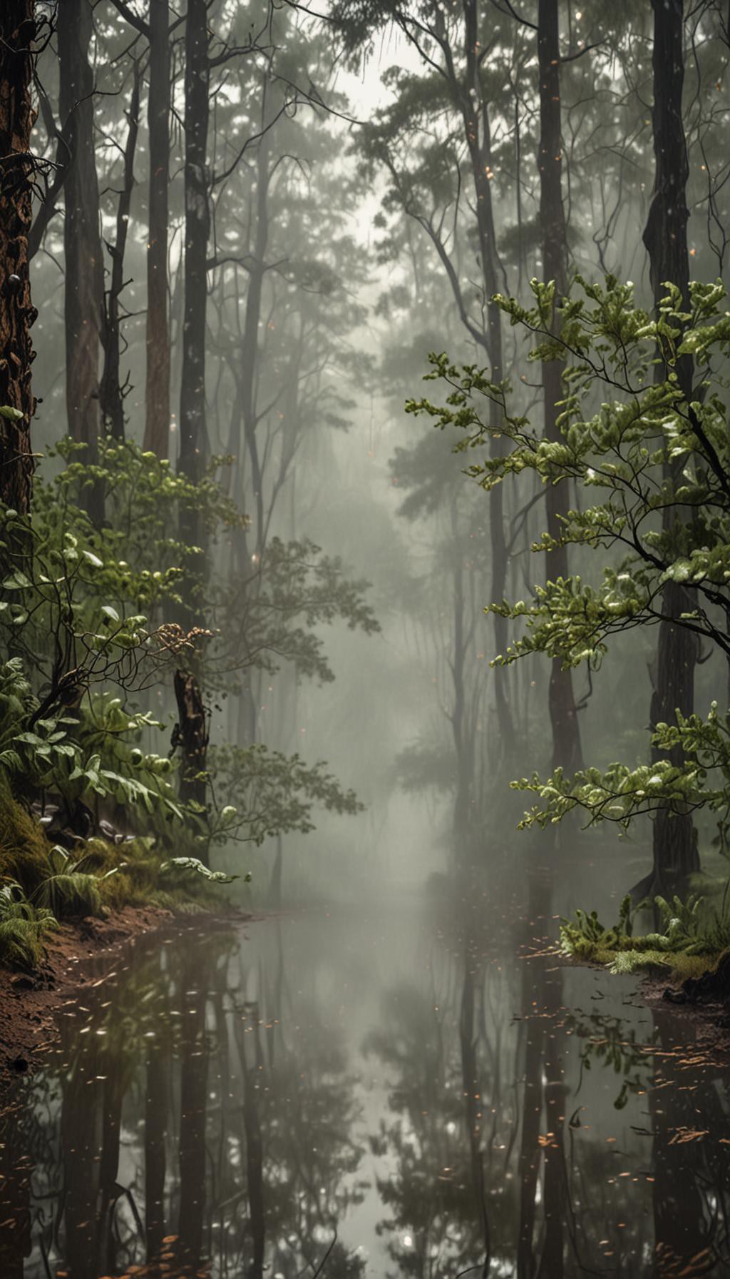 Rainy Pine Forest Path – Moody Nature Wallpaper