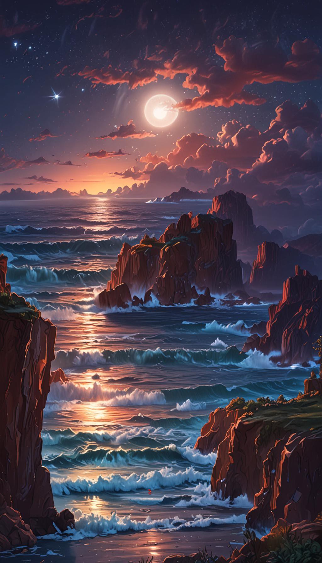 A dreamy anime nightscape with ocean and stars. Perfect for premium 4K and 8K wallpaper lovers.